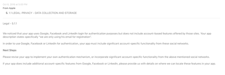 The issue presented itself while implementing an OAuth service for a native iOS app (more specifically, the implementation included OAuth for the Facebook/Google/LinkedIn trio). Rather than encountering a problem with the service itself, the unexpected problem that confronted us was Apple. That is, Apple's App Store Review procedure.
