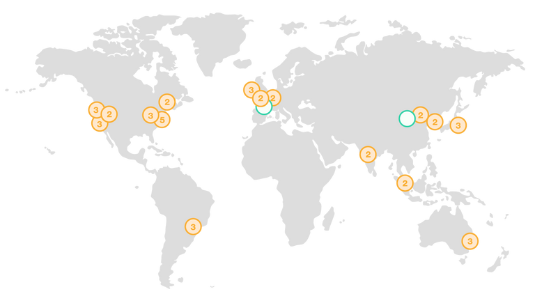 The important twist here is that within the same region network latency is minimal. So we have separate facilities with good interconnectedness. Here is an image of the available regions along with the number of available zones on AWS. Two green circles are new regions that are opening soon (in Paris and Ningxia).